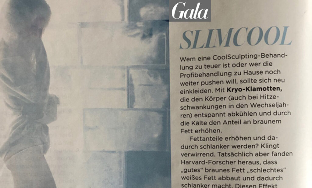 Gala-Autorin Lea Diemel-Rellecke hat verschiedene Kryo-Therapien getestet – mit dabei SlimCOOL. Der Artikel in Ausgabe 44/2020 bietet einen breiten Überblick über die verschiedenen Anwendungsbereiche und Methoden der Kälte-Therapie. Fazit: Kühlung kann viel! Und wer gerne durch Kühlung ein paar Zentimeter Umfang verlieren möchte, „dem eine Coolsculpting aber zu teuer ist oder wer die Profibehandlung zu