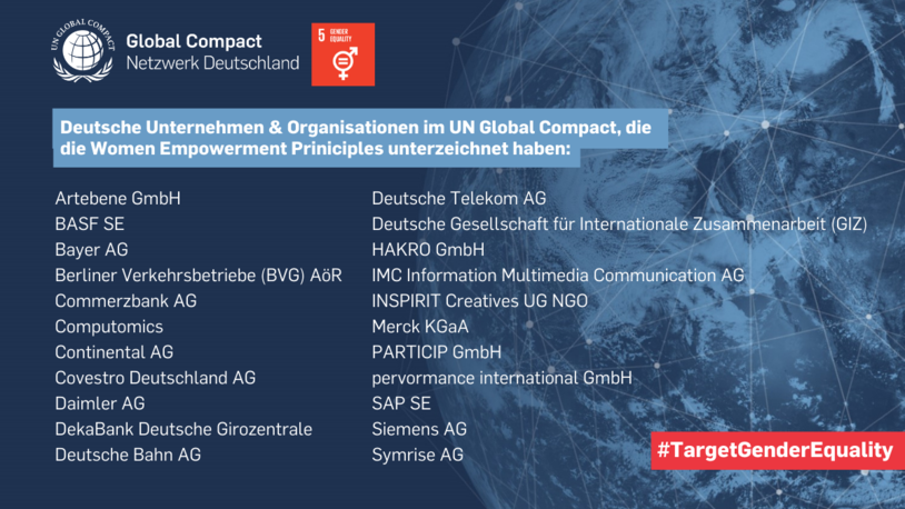 Unterzeichnende der Women Empowerment Principles (WEPs) setzen sich für die Förderung der Gleichstellung der Geschlechter und Stärkung der Rolle der Frau am Arbeitsplatz und in der Gesellschaft ein. Unter den aktuell 53 deutschen Unternehmen und Organisationen, die bereits dem WEPs-Netzwerk beigetreten sind, sind 22 Unternehmen ebenfalls Mitglied im UN Global Compact. pervormance hat die WEPs bereits 2012 unterzeichnet.