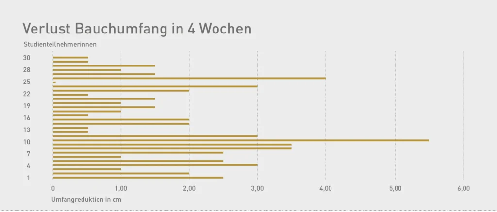 Dabei war die Taille der Studienteilnehmerinnen um durchschnittlich fast 4 cm (3,6 cm) schmäler als vor den 4 Wochen. Die Spitzenreiterin hatte 10,3 cm Umfang verloren und war total happy. Hier einige der Ergebnisse: